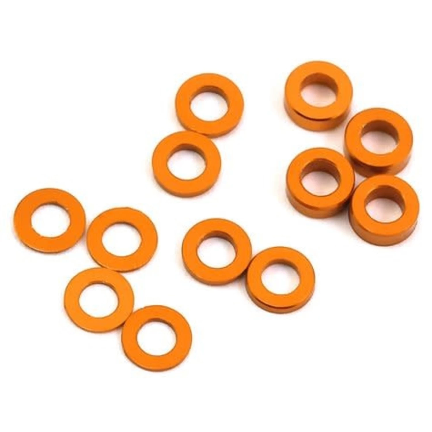 This ProTek R/C Aluminum Ball Stud Washer Set includes 3×5.5mm Orange anodized aluminum washers in the following thicknesses: 0.5mm, 1.0mm and 2.0mm. There are four washers included for each thickness, equaling twelve washers total.