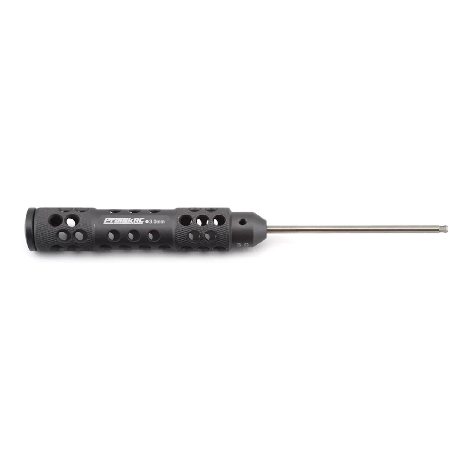The ProTek R/C “TruTorque SL” 3.0mm Ball End Metric Hex Driver features a large 20mm diameter handle with machined relief holes and cross hatch knurling to reduce weight and provide a high grip surface. The end of the handle features a rotating end cap that allows the tool to spin in your palm, maximizing comfort during long wrench sessions. Plus, the tip size is laser etched in not one – but the THREE different spots on the handle to help simplify identification.