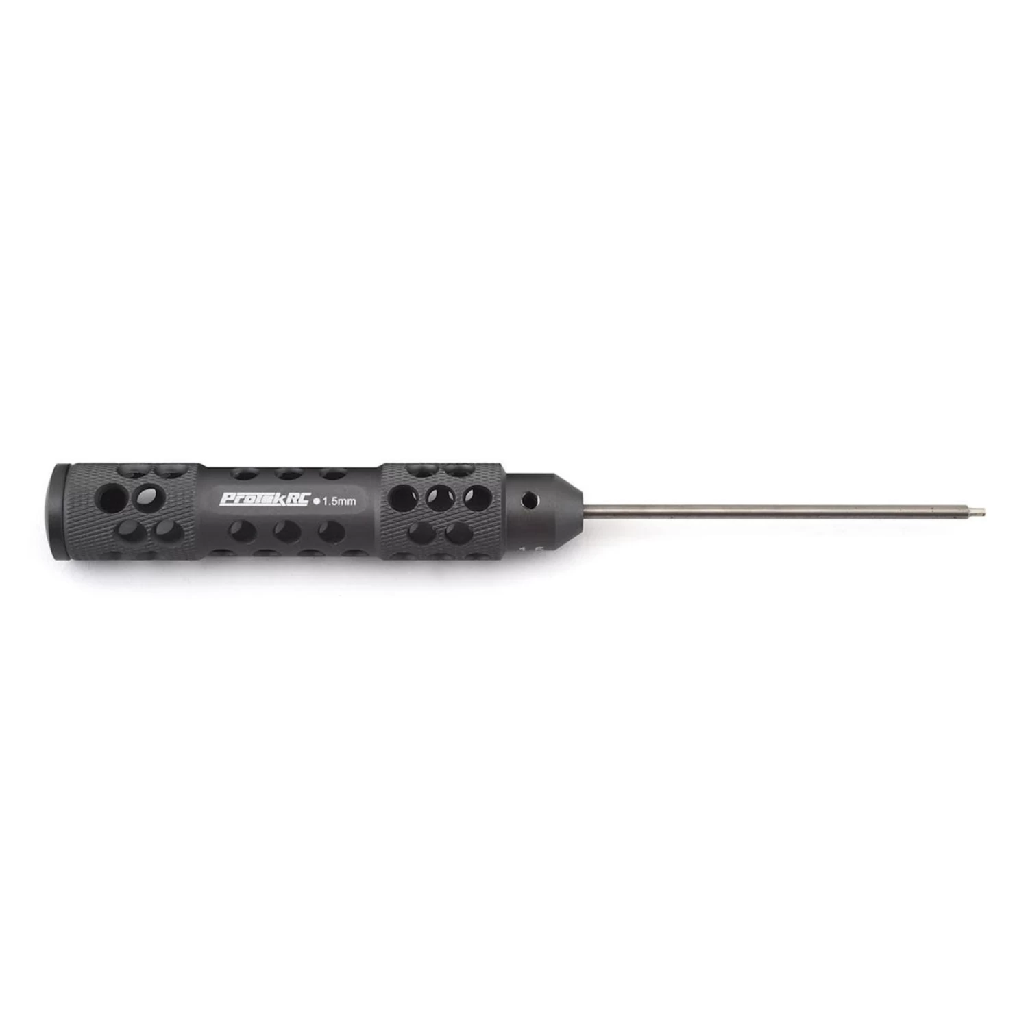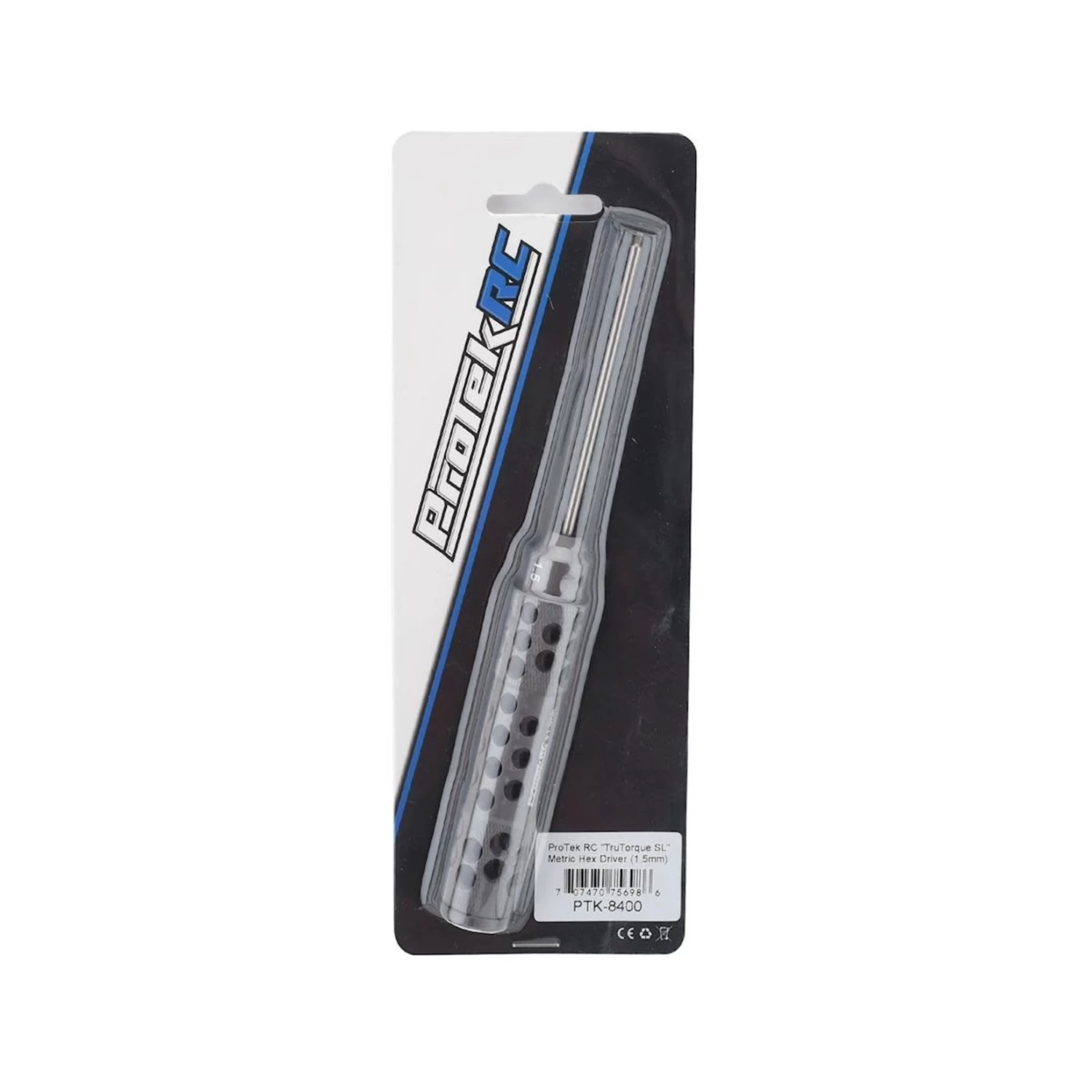 The ProTek R/C “TruTorque SL” 1.5mm Metric Hex Driver features a large 20mm diameter handle with machined relief holes and cross hatch knurling to reduce weight and provide a high grip surface. The end of the handle features a rotating end cap that allows the tool to spin in your palm, maximizing comfort during long wrench sessions. Plus, the tip size is laser etched in not one – but the THREE different spots on the handle to help simplify identification.